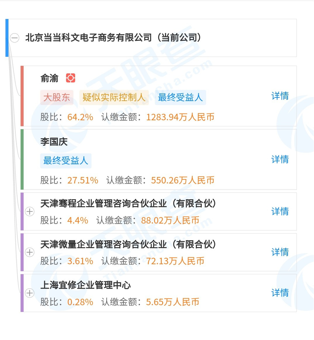 **(1)噹噹工商登記的股權結構。**噹噹科文對外明示的股權結構是俞渝64.2%、李國慶27.51%,其他三個小股東8.29%。。顯然俞渝股權超過了50%,處於控股地位。即使李國慶能聯合其他三位小股東,也不可以基於這樣的股權結構召開合法有效的股東會。