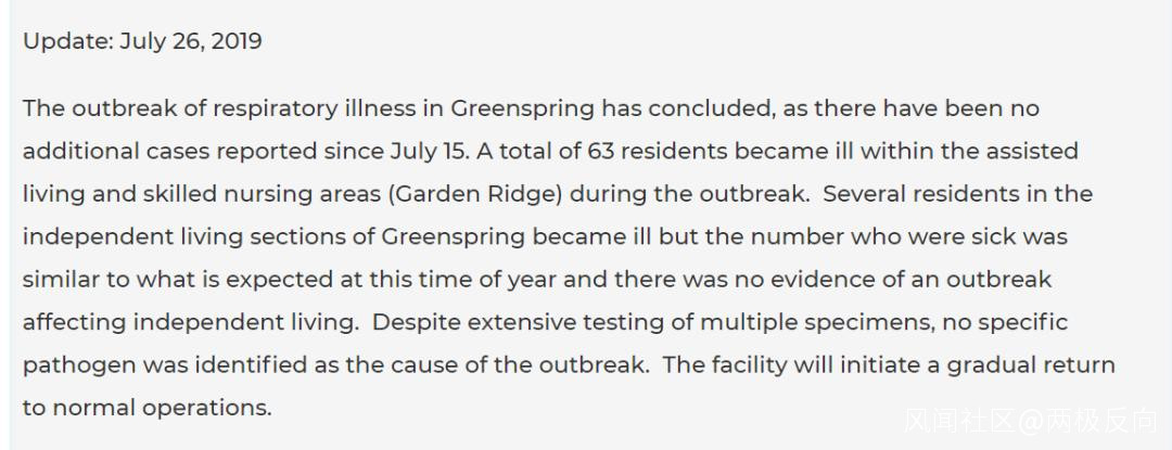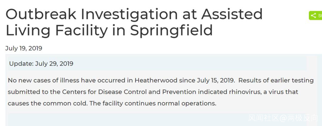 圖片來源:費爾法克斯縣衞生局官網2019年7月29日,費爾法克斯縣衞生局發佈公告:自7月15日起希瑟伍德養老院沒有報告其他病例,此前疾控中心的檢測顯示有引起普通感冒的鼻病毒存在,該養老院將繼續正常運行。按照美官方信息,費爾法克斯縣養老院暴發的呼吸系統疾病可能是鼻病毒導致的普通感冒,但此次事件引發廣泛關注並非沒有道理。費爾法克斯縣衞生局曾表示,在易感染的老年人聚集設施中暴發呼吸系統疾病並不罕見,但這次暴發的不同之處在於,它發生在7月份,而大多數此類事件發生在冬季流感季。