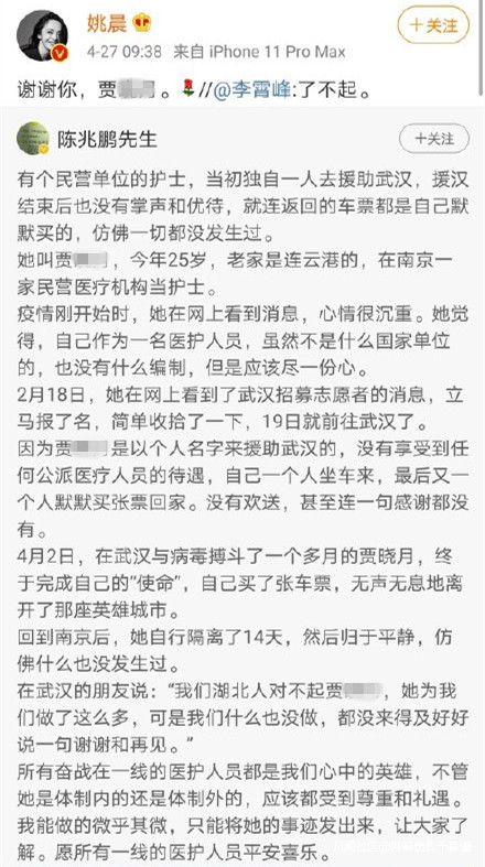 轉發民營抗疫護士無優待,姚晨又翻車了…_風聞