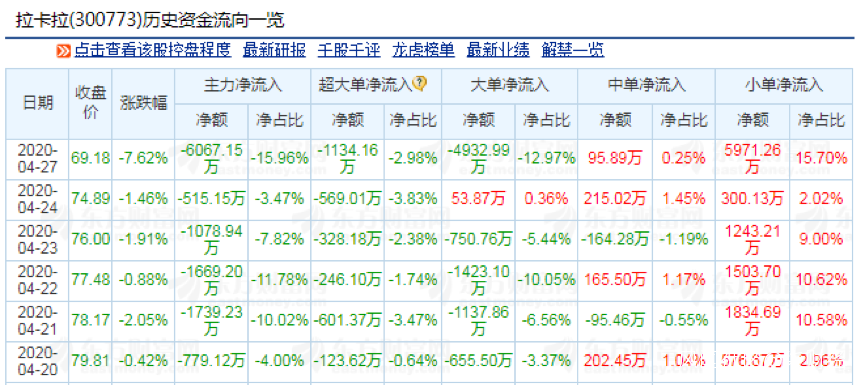 而在今年2月24日,拉卡拉股價一度升至101.37元/股。另據東方財富Choice數據顯示,自4月20日起六個交易日,主力、超大單表現消極,每日呈流出狀態。