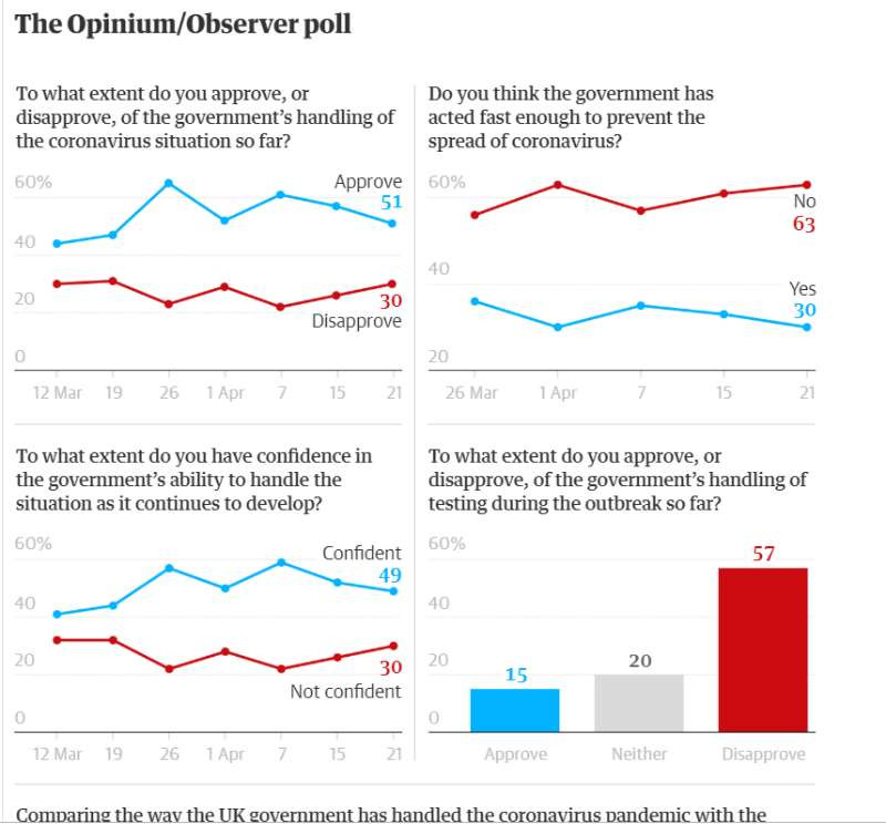 據英國《衞報》26日報道,據最新的Opinium民調結果顯示,過去兩週內英國民眾對於英國政府應對新冠肺炎疫情的認同及信任程度明顯下降 ,尤其是早期其他國家採取追蹤接觸者、封城、禁足等措施,而英國卻沒有儘早採取類似措施;但仍有51%的受訪者表示認同政府的抗疫政策。