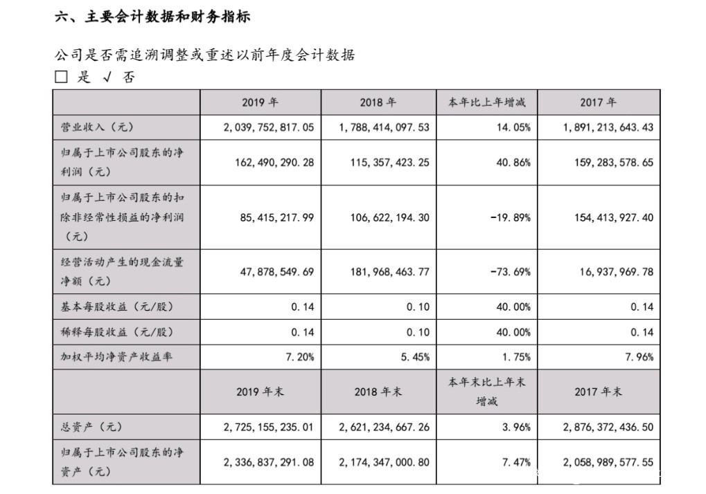 4月24日,加加食品(002650.SZ)發佈2019年年度報告,2019年加加食品實現營業收入20.40億元,同比增長14.05%;歸屬於上市股東的淨利潤為1.62億元,同比增長40.86%;而歸屬於上市公司股東的扣除非經常性損益的淨利潤(下稱“扣非淨利潤”)為8542萬元,同比下降19.89%;經營活動產生的現金流量淨額為4788萬元,同比下滑73.69%。