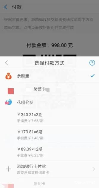 因為花唄當面花有150元以下限定條件,所以消金時代再次嘗試大額支付,在選擇充值998元后,我們發現,在大額支付項下,用户可以選擇花唄分期付款。值得注意的是,信用卡此時不能用於支付。