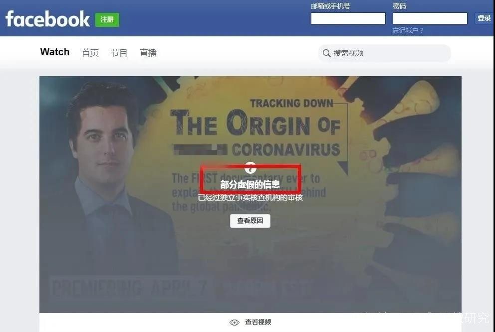 4月7日,“大紀元時報”在一段關於“追蹤病毒源頭”的視頻裏,炒作這個謠言,還將其包裝成了一個時長近一小時的“紀錄片”,在“優兔”、“臉書”等境外主流社交平台擴散傳播。尷尬的是,“臉書”很快就將該炒作謠言的視頻打上了失實的標籤。