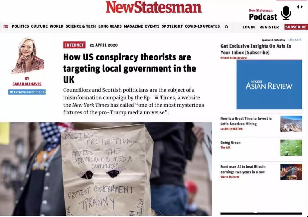 4月21日,英國主流媒體《新政治家》雜誌網站登載文章《美國陰謀論者如何瞄準英國地方政府》(How US conspiracy theorists are targeting local government in the UK),曝光了英國多位地方議員收到“法輪功”媒體“大紀元時報”羣發的充斥着新冠病毒謠言的電子郵件。