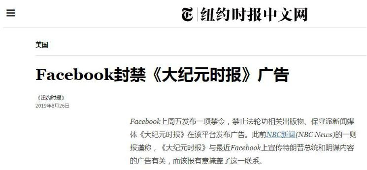 《新政治家》文章指出,“大紀元時報”一直是特朗普的狂熱擁護者。美國全國廣播公司(NBC)曾調查發現,該報在“臉書”(Facebook)上投入150萬美元,打出1.1萬個親特朗普廣告。由於有違“臉書”政治透明度規則,該報一度被禁止投放廣告。