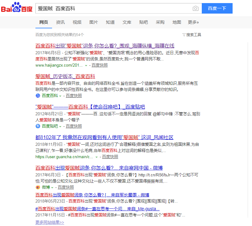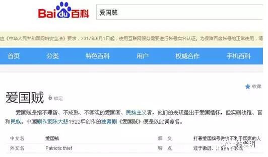 一個有意思的事是,當我在百度搜索欄中輸入“愛國賊 百度百科”關鍵字時搜到的結果是: