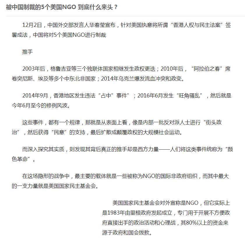 歐美很多NGO組織(非政府組織),實質上背後最大的金主就是政府。歐美大量NGO組織在華開展活動已經數十年,他們做了大量的慈善類公益活動。我們不能認為所有NGO組織都是CIA之流的白手套,但是那些隱秘成為白手套的NGO組織數十年來通過發展國內代理人一直在搞事,而他們搞事時最常用的兩種手法就是,要麼宣揚政府亂作為忽視普通民眾的知情權和話語權,要麼就是煽動民粹主義遊行罷工。礙於國內外輿論壓力和白手套的多層代理人的狡詐手段,國內對此類行為的打擊一直效果有限,直至2019年的香港暴亂。