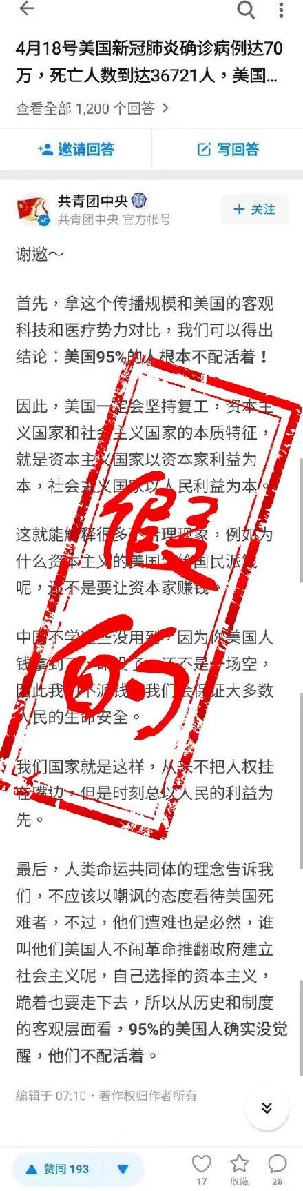 從這篇假文中我們不難發現,此文抓住了中國大陸網友嘲諷‘美國政府消極防疫奢求復工’、‘抗疫新冠表明中國社會主義制度比資本主義制度優秀’、‘CPC執政為民理念’等國內熱議且基本無爭議的話題,通過這些話題引導出‘95%的美國人確實沒覺醒,他們不配活着’的民粹主義結論。客觀來説,這篇假文的文筆比那些“國外華商艱難”之類的反覆洗稿文要強得多,要不是台灣安卓系統輸入法與大陸的差別暴露了他們,我幾乎要相信這真是共青團發的文章了。此類用民眾能接受的論據和敍述方式推導出一個既迎合民族自豪感又貶低世界第一強國的文章,具備很強的煽動性,再輔以最近美國為了甩鍋中國的系列操作,‘自大’與仇美的種子就順利種下了。