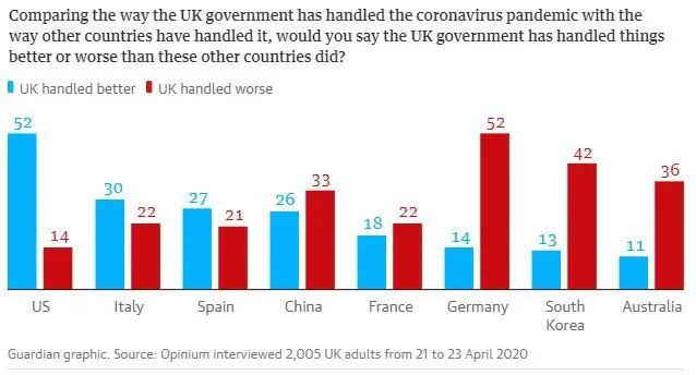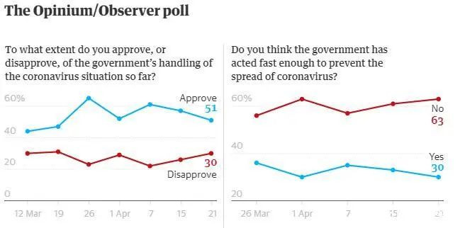 《衞報》稱,過去的兩週英國民眾對於英國政府應對新冠危機措施的信任持續下滑,尤其是早期其他國家採取追蹤接觸者等措施,而英國卻沒有采取類似動作。