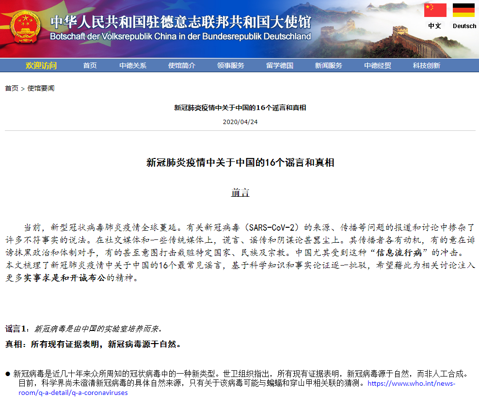 我駐德使館:與中國有關的新冠肺炎16個真相_風聞