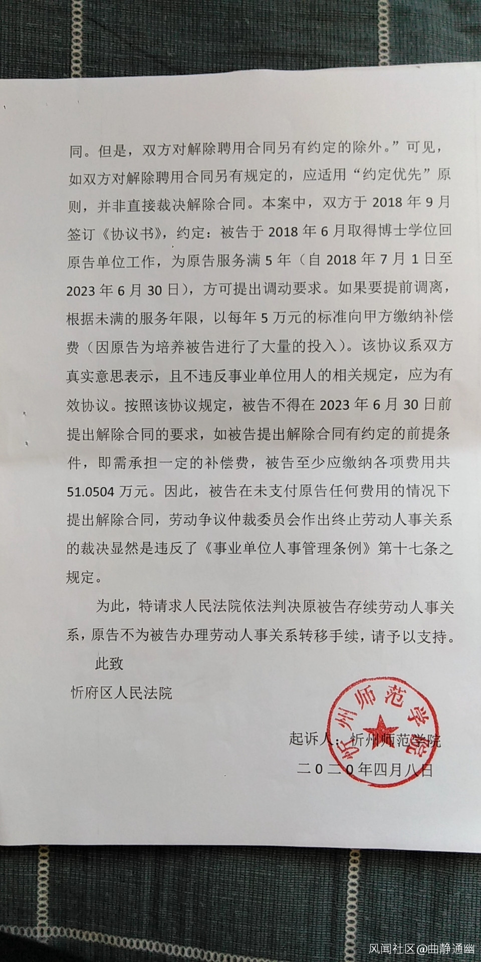 忻州師院在起訴狀中説:雙方於2018年9月簽訂《協議書》,約定被告於2018年6月取得博士學位後回原告單位工作,為原告服務滿5年(2018年7月1日-2023年6月30日)後,方可提出調動要求。如果要提前調離,根據未滿的服務年限,以每年5萬元的標準向甲方繳納補償費(因原告為培養被告進行了大量的投入)。按照該協議規定,被告不得在2023年6月30日前提出解除合同的要求,如被告提出解除合同,至少應繳納各項費用共計51.0504萬元。因此,被告在未支付原告任何費用的情況下,仲裁委作出終止勞動關係的裁決,顯然是違反了《事業單位人事管理條例》第十七條之規定。