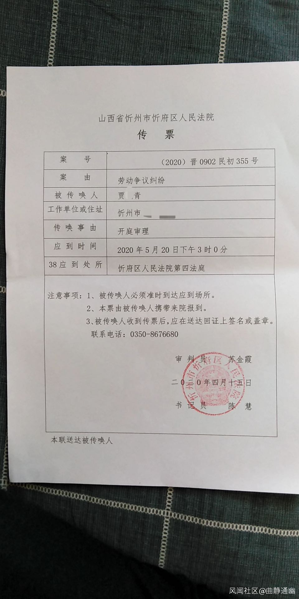 4月17日下午,賈某青收到山西省忻州市忻府區人民法院傳票。