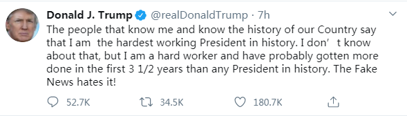 知道我和知道我們國家歷史的人都説,我是史上最勤奮的總統。我不太清楚,但是我工作確實很努力,而且可能在這三年半里的工作已經超過了歷史上任何一位總統。假新聞對這個事實特別憎恨!