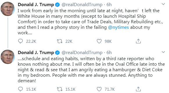 昨天《紐約時報》發了一篇文章,説特朗普在白宮的隔離生活,是整天看電視,然後看到電視上沒人誇他,甚至最近連FOX都不誇他了,他就很生氣,然後在卧室裏吃漢堡、薯條、喝健怡可樂。