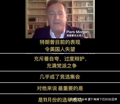 摩根稱這些天看着簡報會自己越來越恐懼,直言特朗普把簡報會變成了一種自我膨脹、自我辯護、過度防禦、政治黨派之爭的“競選集會”。