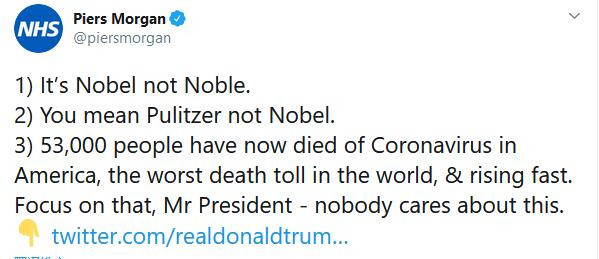 對此,皮爾斯·摩根連發兩條推文駁斥,直指其“胡説八道”,斥責特朗普在疫情已經造成超過5萬美國人死亡的節骨眼上還有心情玩“話術”。
