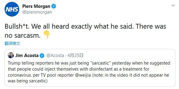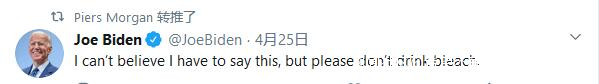 神奇的是,摩根還轉發了特朗普的競爭對手拜登嘲諷其“消毒劑”言論的推文。