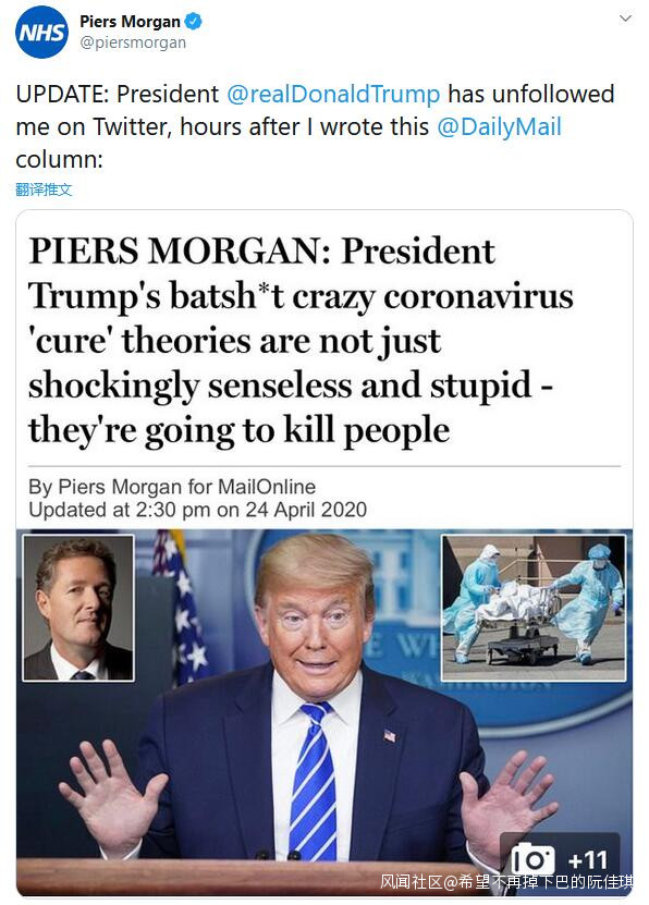 就在摩根批評特朗普堪比“殺人”言論的專欄發佈幾小時後,特朗普大概是受不了這個氣,反手就在推特上取關了這位深交12年的老友。