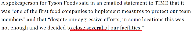 據《時代週刊》報道,泰森食品公司的一位發言人在一份電子郵件中表示,泰森食品公司是“最早採取措施保護一線員工的食品公司之一……儘管我們採取了積極的措施,但在有些地方還不夠,所以我們決定關閉一些設施 ”。