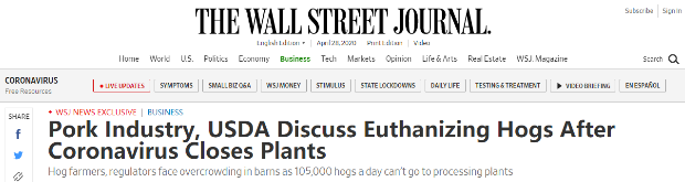 受下游肉品加工企業大面積停產的影響,養殖業也開始“處理”起賣不出去的產能。據《華爾街日報》27日的報道,此前美國生豬屠宰量為每日51萬頭,但受疫情影響,多家大型肉類加工廠停工。