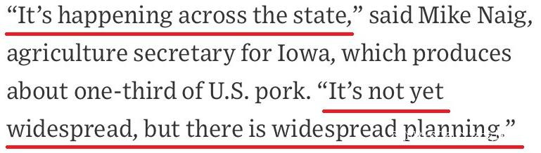 美國愛荷華州提供了全美約三分之一的豬肉製成品,該州的農業部門負責人麥克·內格(Mike Naig)稱,“目前來説這還是個別現象,但它遲早都會在全國蔓延的。”