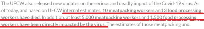 美國最大的肉類包裝和食品加工聯盟——聯合食品和商業工人國際聯盟(United Food and Commercial Workers International Union)稱,截至23日,至少有 10名肉類包裝工人和3名食品加工工人死於新冠肺炎 ,至少5000名肉類包裝工人和1500名食品加工工人直接受到病毒影響 。