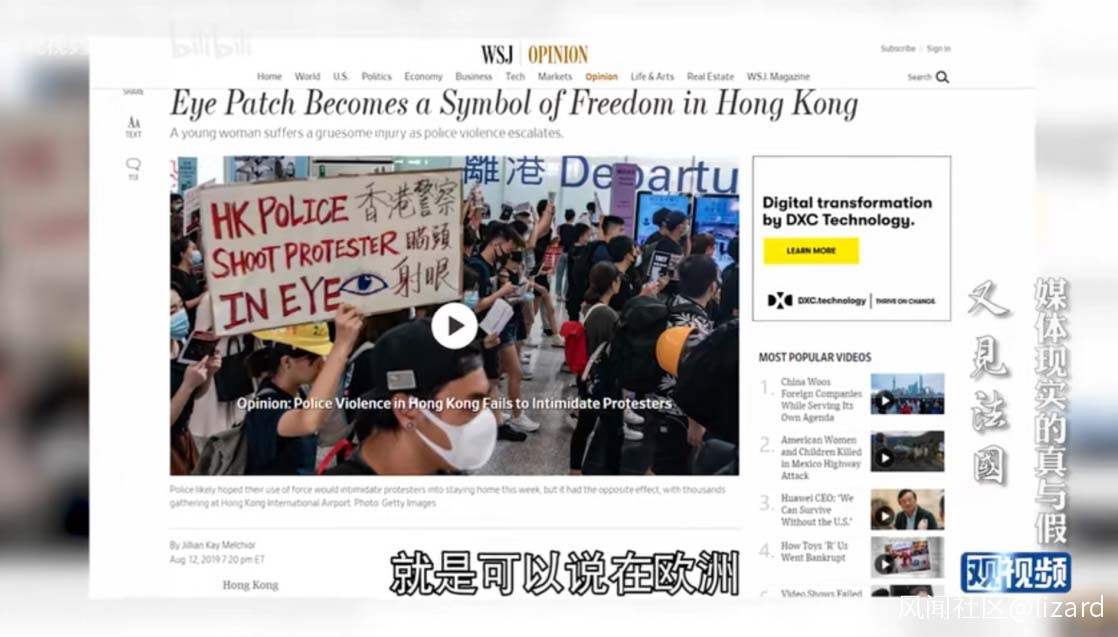 最近還有一件事就是香港。香港發生了一些動盪,有一個女子,一隻眼睛被異物擊中以後可能瞎了,那不得了了,她立刻被描述成為警察暴力下的一個犧牲品。香港的一個人眼睛被警察打下,標題在全世界通行,通行到什麼地步呢?就是可以説在歐洲沒有人不知道這個這個女子的眼睛。