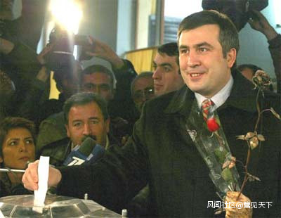 他“學以致用”,在格魯吉亞發動“玫魂革命”,手持玫瑰花率領反對派和示威羣眾衝擊議會,癱瘓國家機器,迫使他的“政治導師”謝瓦爾德納澤無奈下台。他因此而名聲大振。他領導的格魯吉亞被小布什總統誇讚為前蘇聯國家“民主的燈塔”,他本人成了“顏色革命”第一波的“旗手”、“先鋒人物”。