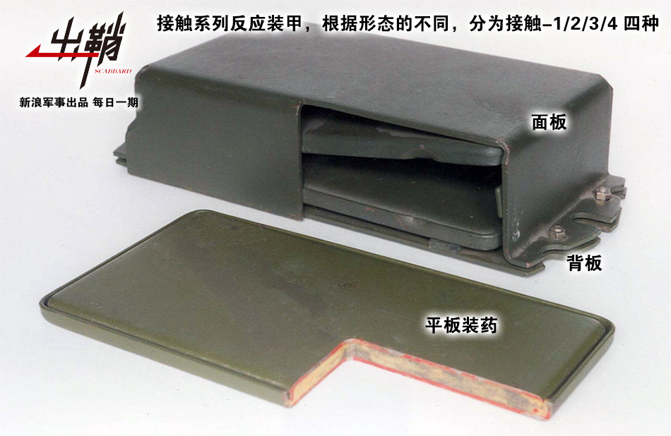 其實根據上文我們提到的理論,反應裝甲在理論上是可以同時對穿甲彈和破甲彈都有較好的防護效果的。但在實際使用中,我們能發現,不論是以色列的Blazer、蘇聯的“接觸”還是我國的FY-1都無法提供令人滿意的防穿甲性能。後來,蘇聯專家們發現,“接觸”爆反對穿甲彈的防護性能不佳最主要的問題是炸藥不夠勁、拋板不夠厚,不能對穿杆進行有效的切割。因此,蘇聯人對“接觸”爆反進行了一系列“魔改”並最終成為了大名鼎鼎的“接觸-5”。從結構上講,接觸-5與老“接觸”並沒有太大的區別,都是一個金屬盒內封裝了呈V形佈置的平板裝藥。不過與老“接觸”不同的是,接觸-5顯著增加了金屬盒的面板和背板厚度,同時也增加了平板裝藥拋板的厚度並使用了更高性能的炸藥。