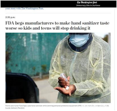 根據FDA數據,這些(求助)電話大多涉及5歲以下兒童,他們無意中食用了洗手液。本月一份報告還稱,一名13歲兒童喝了一家釀酒廠生產的、包裝在酒瓶裏的洗手液,“據稱,其味道與正常飲酒無異”。