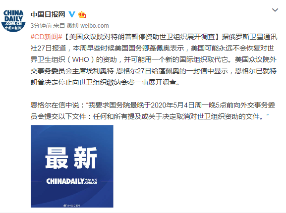 外媒:美國眾議院對特朗普暫停資助世衞組織展開調查來源:中國日報網
