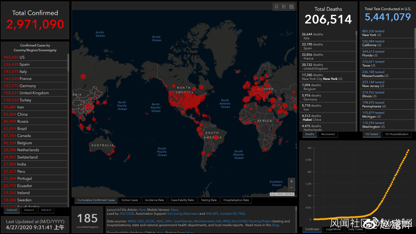 今天全球確診人數達到了297萬人,明天按照我們的數學模型突破300萬一點也沒有問題,全球死亡206514人。現在中國外確診288.6萬人,美國確診96.5萬人,美國死亡54856人,死亡率6.2%,繼續按照我們預測的方向在走。