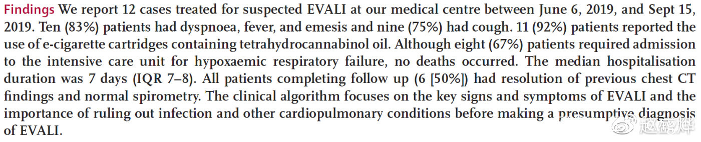 第五,通過論文的全文閲讀,我們能夠理解作者所表達的含義是,該型肺炎的致病原因是不明的,那麼所有符合肺部CT特徵,且不是常規肺炎的病例,也就是“非典型的肺炎”,在美國都會歸屬於“電子煙肺炎”;