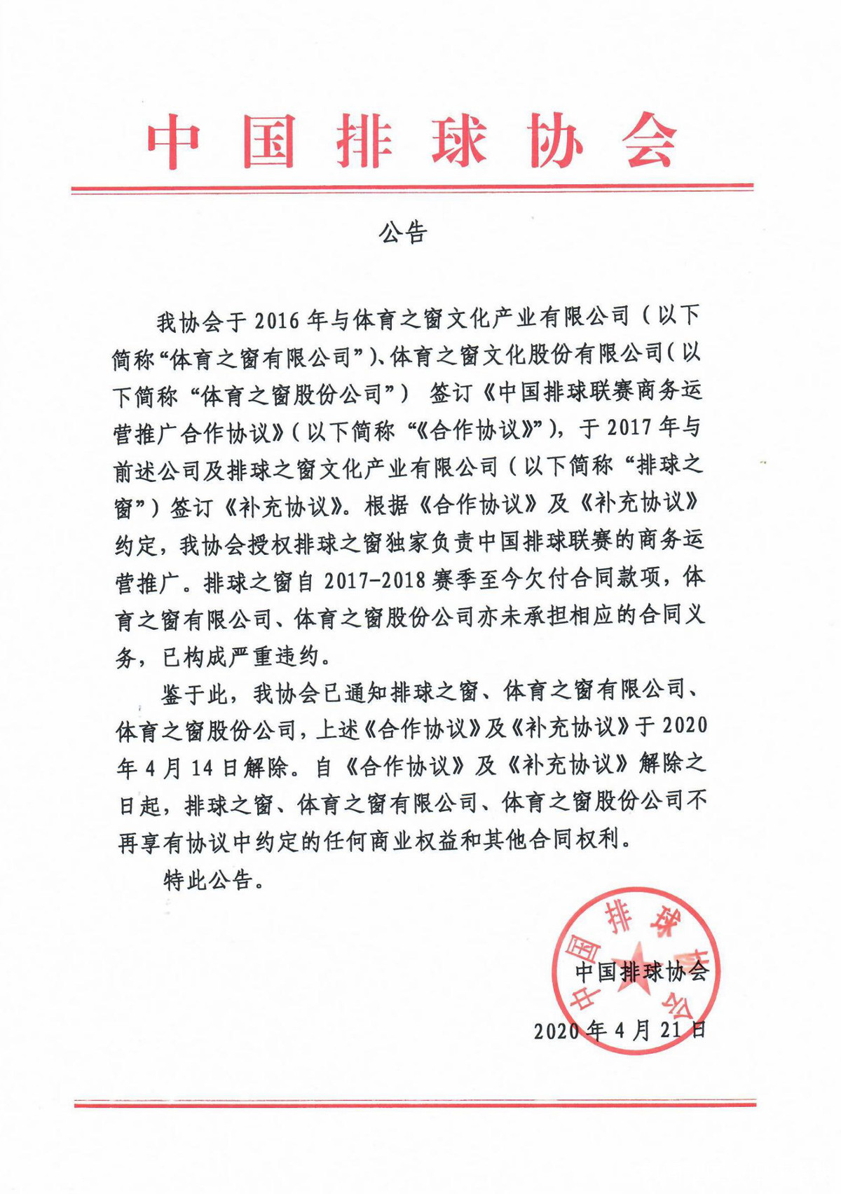 公告表示,因中國排球聯賽的商務推廣方排球之窗長期拖欠合同款項,中國排球協會已於4月14日與其解約。自2016年7月開始作為中國排球聯賽獨家商務運營推廣單位的排球之窗及其母公司體育之窗,至此黯然退場。