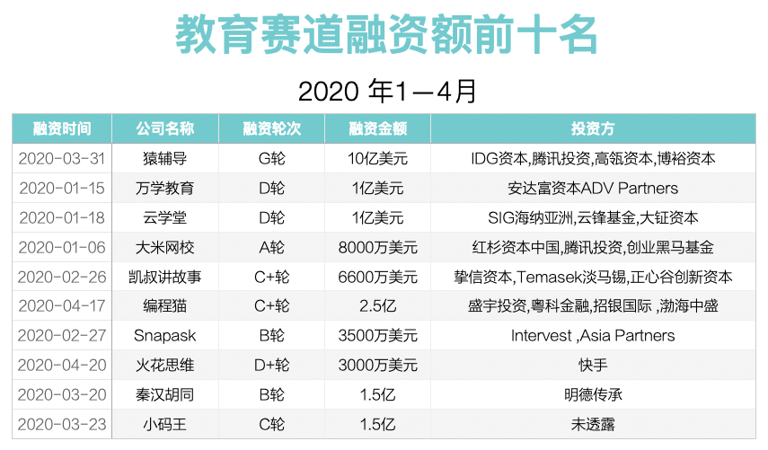 對於教育行業而言,猿輔導於3月末完成F輪融資金額達10億美元,是教育行業迄今為止融資金額最大的一筆。該輪融資由頂級投資機構高瓴資本領投,跟投機構也包括騰訊、博裕資本和IDG資本等頂級投資機構。