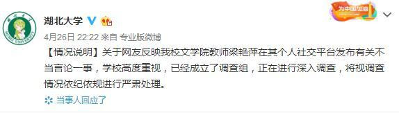 4月26日晚間,湖北大學發佈聲明,對該校文學院教師梁豔萍發佈不當言論一事展開調查。