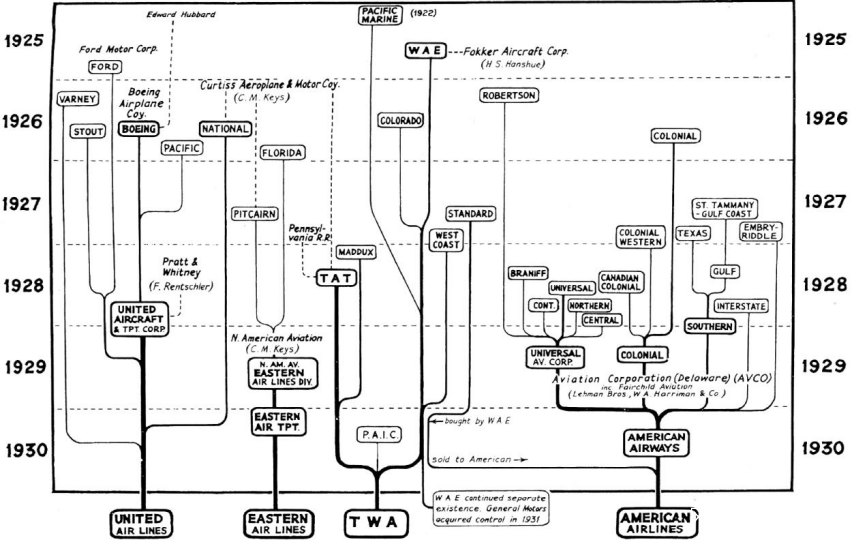 在所有合併中產生的橫貫大陸的三大巨頭是: (1) 聯合航空,由四家合同制郵件運輸公司合併而成。在波音公司的支持下,它的東西海岸航線直接通過芝加哥中轉站將舊金山與紐約連接起來,可以預見的是,它使用的是波音飛機。(2) 美國航空,由美國航空公司(AVCO)控制的三家航空集團合併而成,每家航空集團都是由幾家較小的郵政合同承運人合併而成,或者説是幾家較小的郵政合同承運人的分支。所使用的飛機有許多不同類型,來自許多製造商。(3)洲際和西部航空(T.W.A.A.)是由西部航空快運和洲際航空運輸(T.A.T.A.T.)合併而成的,因為郵政總局局長Walter Brown不同意將郵件合同交給兩家在同一航線上競爭的航空公司。