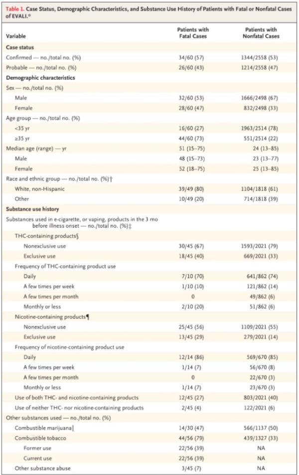 研究者分析了截至2020年1月7日向CDC報告的所有致命或非致命性電子煙或霧化產品相關肺損傷患者。研究者還提供了3例電子煙或霧化產品相關肺損傷死亡患者的病例報告,以説明此類患者的共同臨牀特徵。