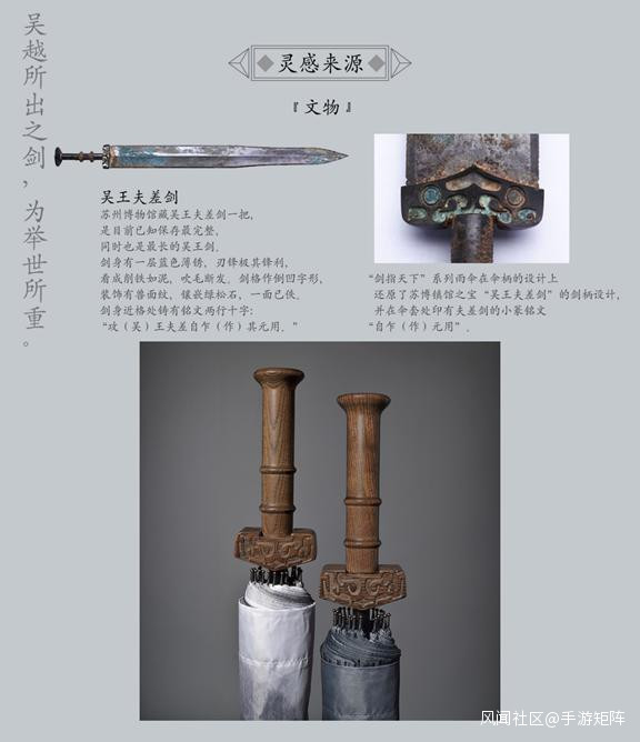 與此同時,在弘揚傳統文化成為遊戲行業主流的當下,網易遊戲則開始進一步探索遊戲文化與傳統文化交互的新邊界。除了遊戲中對饕餮和大禹治水的創新詮釋之外,天下IP也與蘇州博物館攜手推出了劍傘、挎包、餐巾紙等文創主題周邊。以還原吳王夫差劍的劍傘為例,這款文創周邊不僅在設計方面採用了傘柄如劍柄的創意,更巧妙地聯動了劍柄上的獸面紋--也就是俗稱的饕餮紋。而在遊戲中,饕餮異獸形態的設計,也是從古代青銅器饕餮紋中汲取靈感。
