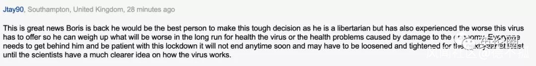 鮑里斯回來了是個好消息,他是自由主義者所以他是做出這個艱難決定的最佳人選,他也經歷了這種病毒所帶來的折磨,因此他可以權衡從長遠來看公眾健康和經濟恢復。每個人都應該站在他身後支持他,並繼續堅持封禁,封禁措施不會很快結束,並且可能至少要在明年放鬆或收緊,也至少要等到科學家對病毒的治療有了更清晰的認識後才能作出決定。