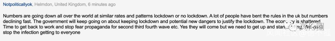 無論有沒有實現封禁,全世界的確診數都在以相似的速度下降,很多英國人在封禁規則上都在打擦邊球,但數量還是在快速下降…但經濟已經受到重創,是時候迴歸工作,停止關於第二波疫情的恐懼了,確實可能會出現第二波,但是我們必須站起來,我們也不能阻止他們感染更多人。