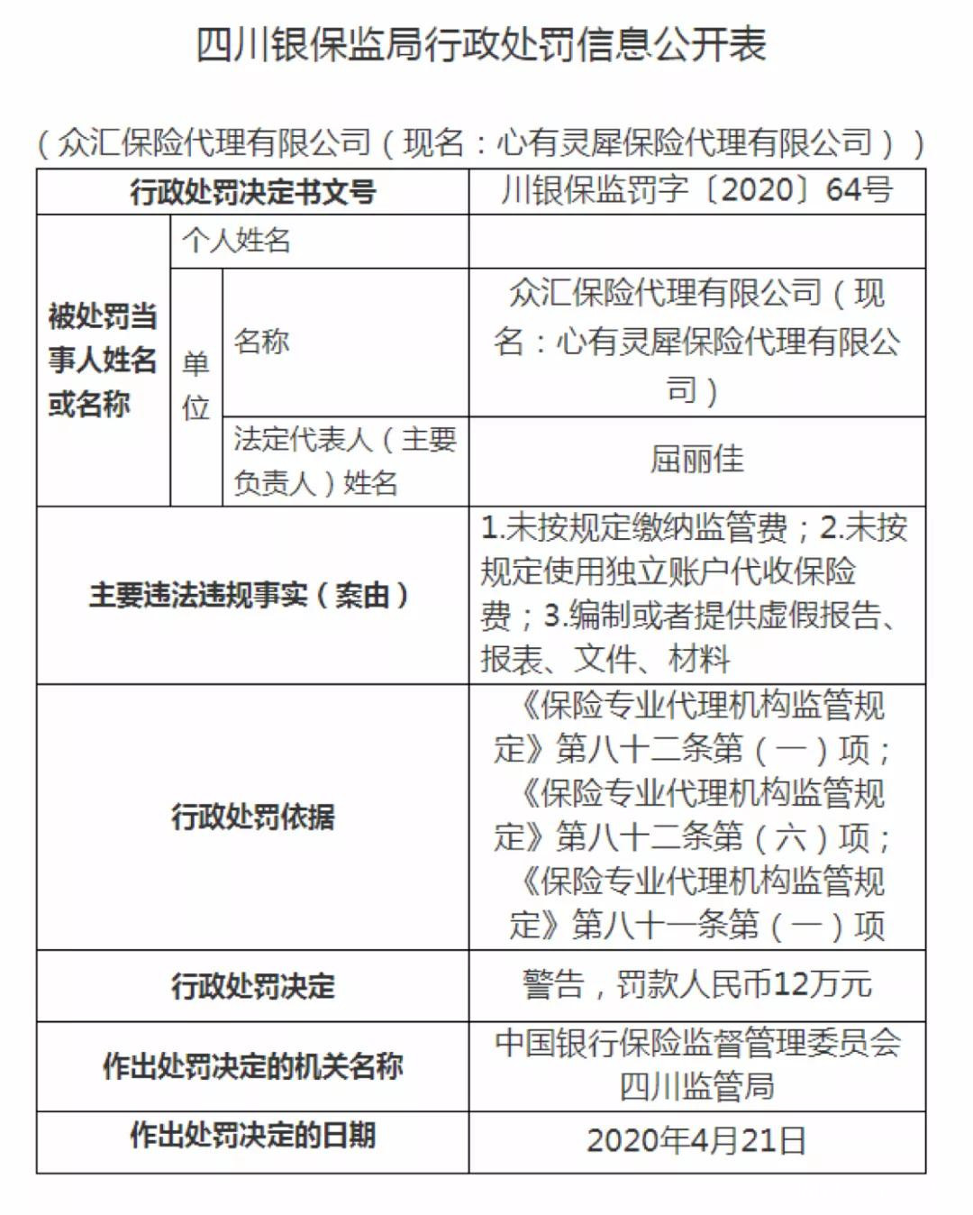 據四川銀保監局於日前對外公佈的行政處罰信息公開表顯示,心有靈犀保險代理有限公司(曾用名:眾匯保險代理有限公司 下稱“心有靈犀保代”)因違規被罰12萬元。