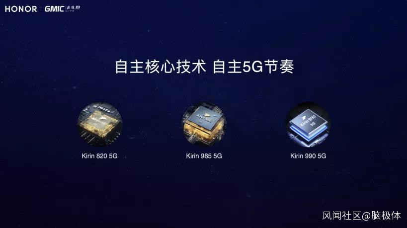 自研芯片的探索之路,延展到2020年初榮耀 30系列發佈時,就集齊了麒麟 820、麒麟 985、麒麟 990的5G SoC“三大神獸”,成為手機行業獨一無二的自研技術大閲兵。