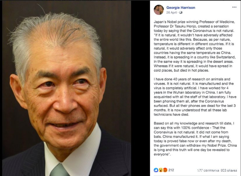 美國當地時間4月25日,社交平台一用户發帖稱,本庶佑教授表示,新冠病毒非“天然”形成,而是“中國研製”,因為該病毒能夠蔓延至全球不同温度帶,所以證明其一定不是天然產生。該發佈還稱,本庶佑教授曾在武漢研究所工作,並“表示”如果此番言論不實,政府大可收回諾獎。
