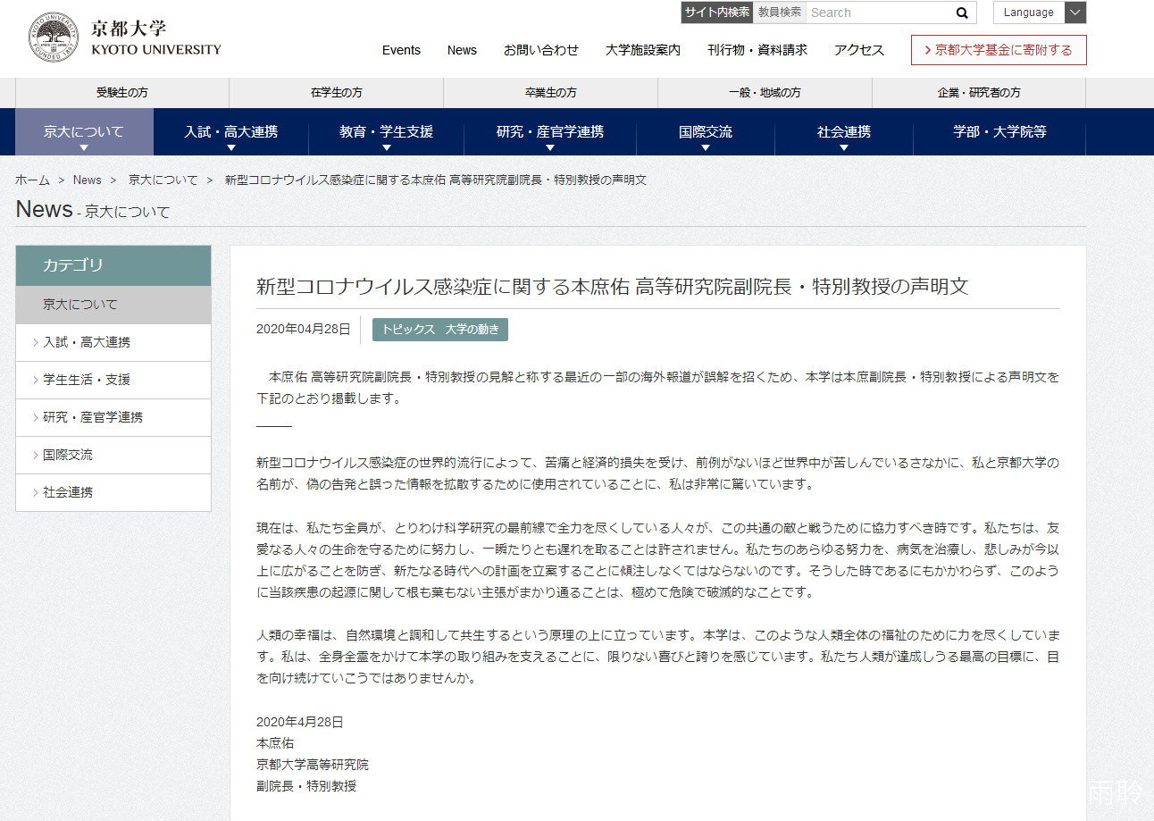 4月28日,本庶佑教授在京都大學網站發佈聲明,駁斥了這一信息虛假、帶有嚴重誤導的帖子。