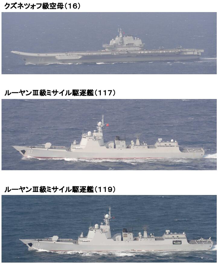 據日本防衞省公開的現場畫面顯示,這支艦隊包括中國海軍遼寧號航母、052D型西寧號驅逐艦、052D型貴陽號驅逐艦、054A型棗莊號護衞艦、054A型日照號護衞艦以及呼倫湖號補給艦。不過日本防衞省未能成功拍攝到呼倫湖號補給艦的畫面,在通告消息中留下了“照片缺失”的字樣。