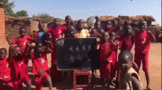 一個部落的背景,一幫非洲夥計圍着一塊黑板,上面寫着客户需要的祝福語。