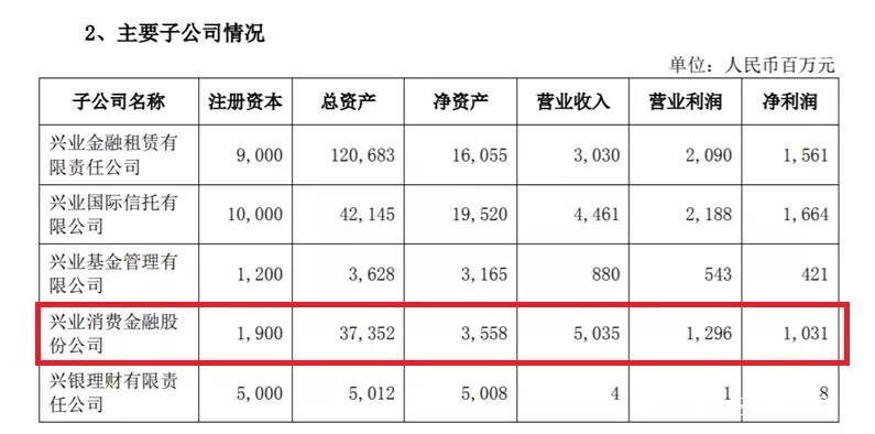 4月28日晚,興業銀行在2019年年報中披露了持股66%的子公司興業消費金融的業績。報告顯示,興業消費金融2019年實現營業收入50.35億元,營業利潤12.96億元,淨利潤10.31億元,同比去年暴增101%。2019年上半年,興業消費金融營業收入為20.88億元,淨利潤為4.42億元。