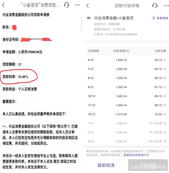 互金商業評論注意到,興業消金與京東數科合作的在這款現金貸產品在費率計算上都採用統一模式,一年期分期產品,前11個月還款金額相同,最後一個月還款金額較高,按IRR計算,綜合利率恰好為36%!